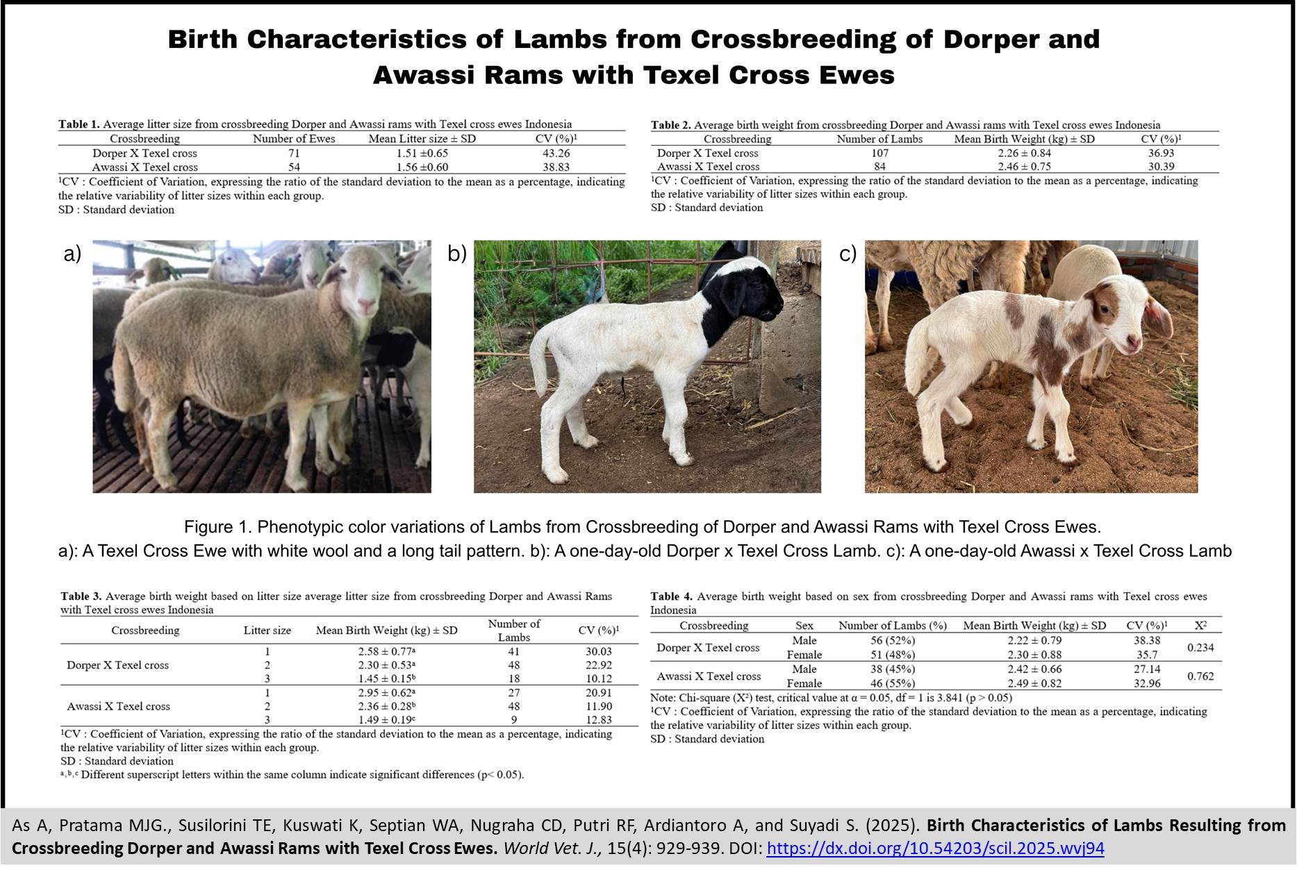 ABSTRACT: Crossbreeding is an effective strategy to enhance sheep productivity under tropical conditions. This study evaluated the birth characteristics of lambs resulting from crossbreeding Dorper and Awassi rams with Texel cross ewes in Indonesia’s tropical environment. The experiment was conducted from April to November 2023 at CV Kambing Burja, Malang Regency, East Java, Indonesia. A total of 125 Texel cross ewes aged 1.5 to over 3 years were naturally mated with 71 Dorper and 54 Awassi rams using a controlled colony mating system at a ram-to-ewe ratio of 1:25. The study employed complete enumeration, including all ewes that successfully lambed during the observation period. Sire groups comprising two to three rams per breed were rotated every 45 days to ensure equal mating opportunities and prevent exhaustion. Estrus synchronization followed a two-step hormonal protocol, including the administration of Conceptase (PGF₂α, 2.5 mL/ewe) intramuscularly to induce luteolysis, followed 48 hours later by PG600 (1.5 mL/ewe) containing eCG and hCG to stimulate follicular development and ovulation. Mating behavior was observed daily, with successful copulation indicated by restlessness, vocalization, and receptivity. Measured parameters included birth weight, litter size, and sex ratio. Results showed no significant differences in mean litter size or birth weight between Dorper × Texel cross and Awassi × Texel cross lambs, although Awassi crosses exhibited more uniform birth weights. Birth weight decreased as litter size increased, and sex ratios remained balanced in both groups. These findings suggest that both Dorper and Awassi rams are suitable for enhancing the reproductive performance of Texel cross ewes under tropical management systems, highlighting the importance of integrating hormonal synchronization and controlled breeding for sustainable sheep production in Indonesia.