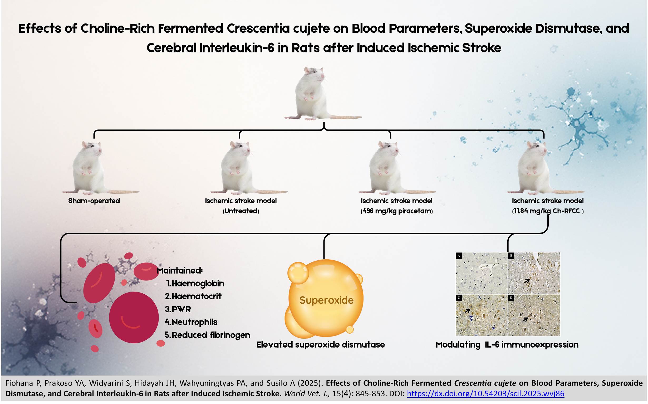 ABSTRACT: Ischaemic stroke is a major vascular disorder that profoundly impacts human health. Choline-rich fermented Crescentia cujete (Ch-RFCC) has emerged as a promising adjunctive therapy for ischemic stroke; however, its effects on hematological parameters, superoxide dismutase (SOD) activity, and interleukin-6 (IL-6) levels remain unexplored. The present study aimed to assess the impacts of Ch-RFCC on hematological parameters, SOD activity, and brain IL-6 levels in the rats' ischemic stroke model (ISM). A total of 40 three-month-old male rats, weighing 247.31 ± 4.95 g, were randomly assigned into four groups, including healthy rats with a skin incision as the control group (sham-operated, T1), ISM without treatment (T2), ISM treated with 496 mg/kg body weight of piracetam (T3), and ISM treated with 11.84 mg/kg body weight of Ch-RFCC (T4). Treatments using piracetam (T3) and Ch-RFCC (T4) were administered orally via gavage twice daily for 14 consecutive days. The current results demonstrated that Group T4 maintained haemoglobin and haematocrit levels, normalised the platelet-to-leucocyte ratio and neutrophil counts, reduced fibrinogen levels, elevated SOD activity, and enhanced IL-6 immunoreactivity compared to the untreated ISM group (T2). Furthermore, rats in Group T4 exhibited the least body weight loss compared to those in groups T2 and T3. These findings indicated that Ch-RFCC may alleviate ischemic stroke in rats by enhancing antioxidant defenses, modulating IL-6 expression, and preserving hematological homeostasis.