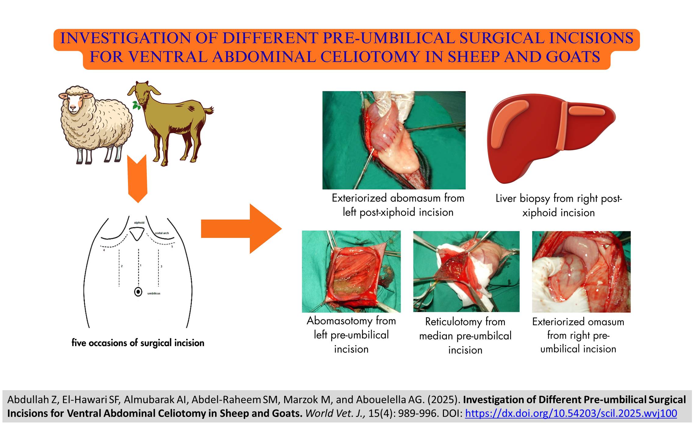 ABSTRACT: Identifying the correct site for surgical incision and reducing unnecessary handling are crucial in veterinary surgical procedures. The current study aimed to evaluate surgical incisions in the pre-umbilical region in small ruminants with correlation to possible surgical operations in the abdominal organs. A randomized experimental study was conducted on 15 sheep (12 females and three males) and 15 goats (12 females and three males), with body weights of 44.9 ± 3.7 kilograms in sheep and 26.3 ± 4.6 kilograms in goats. Five different surgical exposures, including median, left paramedian, right paramedian, left post-xiphoid, and right post-xiphoid, were applied. The accessibility of abdominal viscera was evaluated for each incision site by documenting directly visible organs, organs that could be readily moved to the site of incision, and organs that could only be palpated. Access to the ventral ruminal sac and omentum was achieved through median, left, and right pre-umbilical celiotomy incisions. Furthermore, these surgical approaches allowed for reaching the abomasum and performing of abomasotomy. Abomasotomy and reticulutomy operations were performed through a median pre-umbilical incision. Omasum was palpable and easily examined via the right pre-umbilical celiotomy. The liver and gall bladder were exposed via a right post-xiphoid curved incision. In contrast, the reticulum was accessed for surgical intervention through a left post-xiphoid curved incision. The only recorded postoperative complication was tympany after gastrointestinal surgery. The present study indicated that choosing the appropriate pre-umbilical or post-xiphoid incision greatly improves access to targeted abdominal organs in small ruminants. Right and left pre-umbilical incisions were identified as the most effective approaches for abomasal procedures, whereas post-xiphoid incisions provided the optimal exposure to the reticulum, liver, and gall bladder. Furthermore, access to abdominal organs may vary between sheep and goats when employing the same surgical approach.