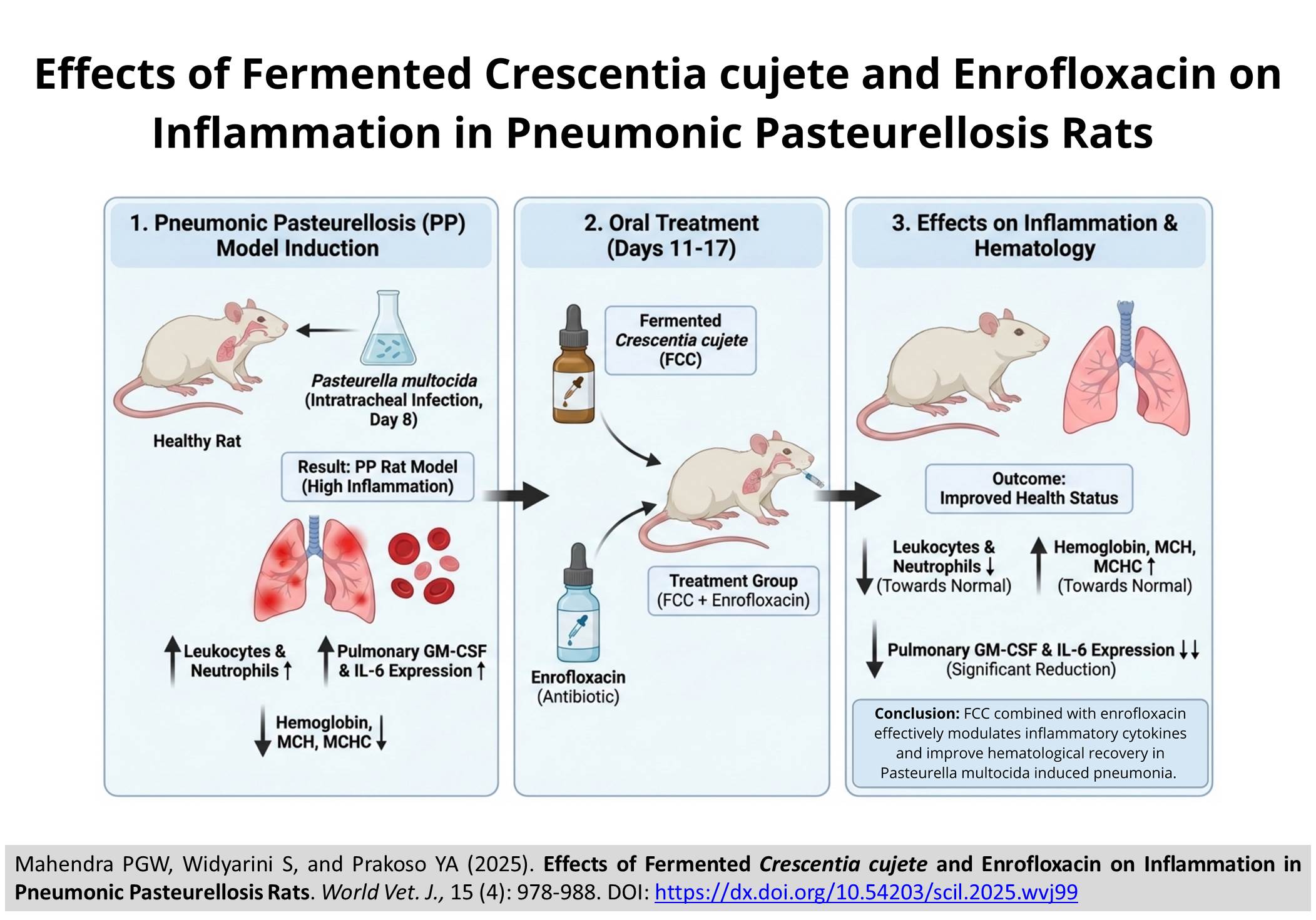 ABSTRACT: Pneumonic pasteurellosis (PP) is a respiratory disease caused by Pasteurella multocida (P. multocida) with broad host susceptibility and zoonotic potential. Pasteurellosis is classified as a strategic infectious animal disease and a neglected tropical disease in Indonesia, highlighting the need for effective supportive therapies. Fermented Crescentia cujete L. (FCC) contains bioactive compounds with anti-inflammatory and antioxidant activities. The present study aimed to evaluate the anti-inflammatory effects of FCC combined with enrofloxacin on hematological parameters and the immune expression of granulocyte-macrophage colony-stimulating factor (GM-CSF) and interleukin-6 (IL-6) in an induced PP rat model. Twenty male Sprague-Dawley rats, three months old and weighing 250-300 g, were divided into five groups, including healthy control (P1), untreated infected rats (P2), rats treated with 20 mg/kg body weight (BW) of enrofloxacin (P3), rats given 20 and 30 mg/kg BW of enrofloxacin and ibuprofen, respectively (P4), and rats administered 20 and 5.92 mg/kg BW of enrofloxacin and FCC (P5), respectively. After a 7-day acclimatization, rats were infected intratracheally with P. multocida on day 8, and treatments were administered orally for seven days starting on day 11. Hemoglobin, mean corpuscular hemoglobin (MCH), and mean corpuscular hemoglobin concentration (MCHC) decreased significantly in P2 compared to P1, with no difference between P2 and P3. Although hemoglobin, MCH, and MCHC improved in P4 and P5 toward control levels, most variables remained significantly different from P1. Leukocyte and neutrophil counts were significantly elevated in P2 compared to P1; however, P5 demonstrated a declining trend toward normal values and did not differ significantly from P1. Pulmonary GM-CSF and IL-6 immune expression increased markedly in P2 compared to P1. Groups P3 and P4 exhibited elevated cytokine expression compared to P1, without significant differences from P2. In contrast, P5 indicated a significant reduction in GM-CSF and IL-6 expression compared to P2, reaching levels comparable to those of P1. The FCC combined with enrofloxacin improved hematological status and modulated inflammatory cytokines in PP. The present findings indicated that FCC could be a potential supplementary treatment for managing inflammation and aiding hematological recovery in bacterial infection pneumonia.