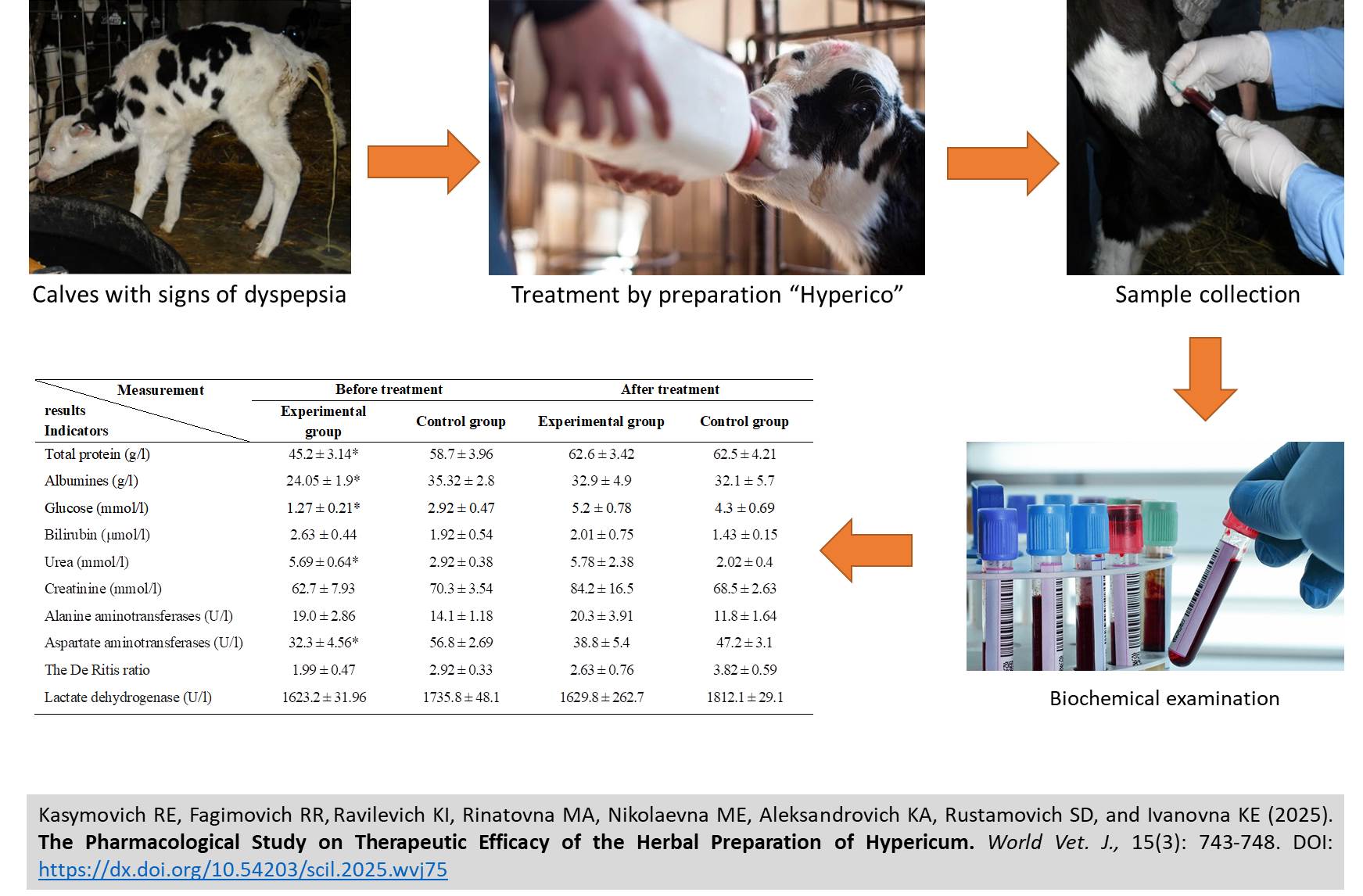 ABSTRACT: Dyspepsia is a condition associated with digestive disorders, including diarrhea, weakness, dehydration, and intoxication. The investigation and application of therapeutic and prophylactic agents for managing gastrointestinal diseases in young cattle, including dyspepsia in newborn calves, is concerning. The present study aimed to investigate the biochemical mechanisms of action of Hypericum in the treatment of dyspepsia in newborn calves. Two groups of black and white breed bulls (five animals per group), aged 8-10 days, were assigned to assess the effects of Hypericum on biochemical parameters, including total protein, albumin, glucose, bilirubin, urea, creatinine, aspartate aminotransferase, alanine aminotransferase, and lactate dehydrogenase. Calves in the first group (n = 5), exhibiting pronounced signs of dyspepsia, were administered the treatment. This treatment consisted of 250 mL of Hypericum, combined with 500-700 mL of warm water, instead of milk, during the following two feedings. Then, milk was added to each serving of this mixture until the total volume reached 1.25-1.50 liters, and it was given to calves until clinical signs of recovery appeared. Calves of the second group (n = 5) were clinically healthy and received boiled water instead of the Hypericum. The current findings demonstrated that the biochemical parameters of the experimental calves improved following the administration of Hypericum, reaching levels comparable to those of clinically healthy calves. After prophylactic administration of Hypericum at a dose of 6.5 mL/kg during the first six feedings, the general condition of the experimental calves was satisfactory. In the experimental group of calves administered Hypericum at a dosage of 6.5 mL/kg mixed with milk over a period of two days, only one out of fifteen calves exhibited signs of dyspepsia, including liquid feces and lethargic behavior within the initial four days, representing a prevalence of 6.7%. Hypericum could prevent the occurrence of dyspepsia by 93%. The utilization of Hypericum had a therapeutic influence and positively impacted the clinical condition, behavior, and appetite of the calves.
