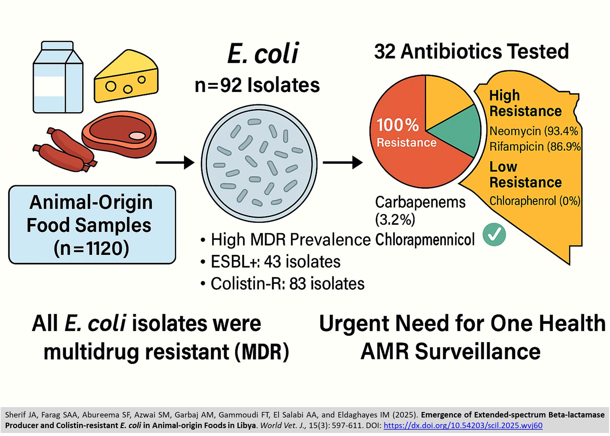 ABSTRACT: The increasing prevalence of Escherichia coli (E. coli) infection poses significant health challenges worldwide. Understanding the genetic, pathogenic, and antimicrobial resistance profiles of E. coli is crucial for effective diagnosis and treatment. The present study aimed to assess the prevalence and antimicrobial susceptibility patterns of E. coli isolated from different samples of food products from animals, with specific attention to identifying and characterizing extended-spectrum beta-lactamase (ESBL)-producing isolates. The present study analyzed 92 E. coli isolates obtained from 1120 food samples, including milk, dairy products, meat, and meat products, collected randomly from retail markets in Libya. The isolates were tested for antimicrobial susceptibility, and the antibiotic resistance profiles were evaluated using 32 antibiotics from 12 different classes. Multiple antibiotic resistance (MAR) and antibiotic resistance index were calculated, with MAR ≥ 0.2 indicating high antibiotic resistance. Isolates were categorized as multidrug resistant (MDR), extensively drug-resistant (XDR), or pan drug-resistant (PDR) based on standard definitions. The ESBL production was assessed using the double-disc synergy test, and colistin resistance was tested using the agar diffusion method. Antimicrobial susceptibility testing of E. coli isolates revealed 100% resistance to penicillin and cloxacillin, with high resistance rates observed against neomycin (93.4%), rifampicin (86.9%), and methicillin (75%). However, all isolates were susceptible to chloramphenicol, whereas carbapenems (imipenem, meropenem, ertapenem) indicated the lowest resistance (3.2%). Cefepime demonstrated the highest effectiveness among cephalosporins, with a resistance rate of 1.08%. The MAR ranged from 0.09 to 0.6, with the highest MAR value (0.6) observed in isolates resistant to 20 antibiotics. All isolates were MDR, but no XDR or PDR strains were detected. Among the 92 isolates, 43 were confirmed as ESBL producers, primarily originating from raw milk, lben (fermented milk), and other dairy products. In addition, 83 isolates demonstrated phenotypic resistance to colistin. The present study highlighted the significant presence of MDR E. coli in food products of animal origin, particularly raw milk, fermented milk, and chicken meat in Libya, emphasizing the urgent need for antimicrobial stewardship, stronger regulatory frameworks, and integrated One Health surveillance approaches to combat AMR in Libya.