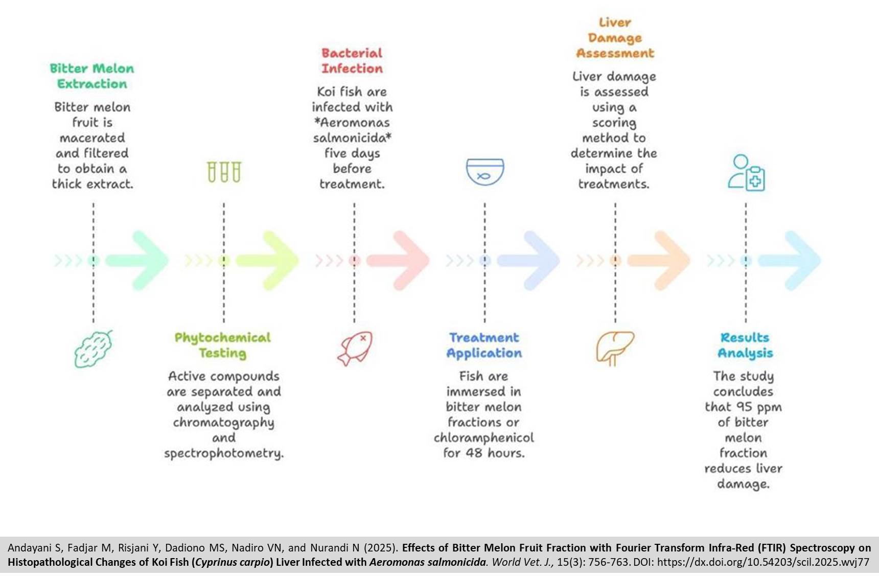 ABSTRACT: Bitter melon is widely recognized for its medicinal properties, including its potential health benefits in various species. The present study investigated the impact of the bitter melon fraction on liver histological changes of koi fish infected with Aeromonas salmonicida (A. salmonicida). Maceration of bitter melon fruit was carried out for 4 days, then filtered and evaporated to obtain a thick extract. Phytochemical testing included column chromatography for the separation of active compounds and UV-Vis spectrophotometry for the analysis of the absorbance spectra of the fractions. The A. salmonicida bacterial infection was performed five days prior to the fish being soaked in a bitter melon fraction, at a bacterial density of 10⁷ cells/ml for 48 hours. A completely randomized design was employed, featuring five treatments, including no bitter melon fraction with no infection (K -), other groups infected with A. salmonicida and supplemented with 75 ppm of bitter melon (A), 95 ppm of bitter melon (B), 115 ppm of bitter melon (C), and 5 ppm chloramphenicol (antibiotic, K +). Each treatment group consisted of 15 fish (average length and weight of Koi fish were 8 cm and 12 grams) with three replications, which were immersed in their respective solutions for 48 hours. The current study adopted the maceration method with 98% ethanol for the extraction of bitter melon fruit. To determine liver histological damage in Koi fish, the authors employed the scoring method. The findings indicated slight liver damage in histology parameters with an average score of 1.2-1.4 for treatments A and B, respectively; however, treatment C and the positive control exhibited moderate damage with an average necrosis score of 2. According to the obtained data, the bitter melon fruit fraction at a concentration of 95 ppm had the highest preventive effects on the liver of the Koi fish infected with A. salmonicida.