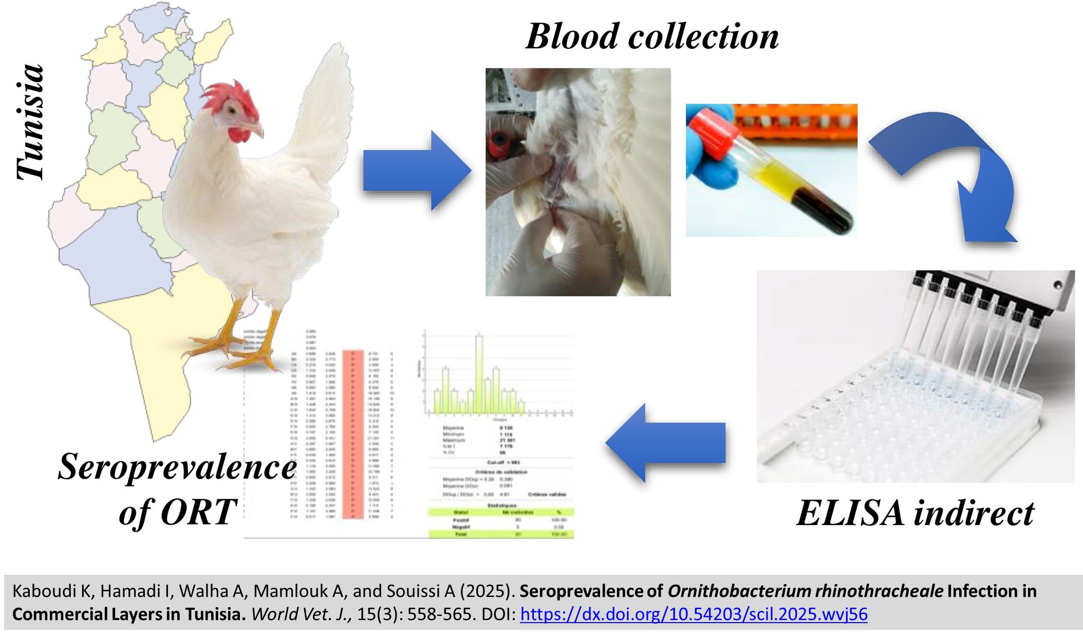 ABSTRACT: Ornithobacterium rhinotracheale (ORT) infection is a worldwide disease in commercial poultry production. It is caused by a gram-negative bacterium, inducing respiratory and articular infections. The present study investigated the seroprevalence of ORT in commercial laying chicken farms in the Sfax region of South-eastern Tunisia. Diagnosis of ORT is based on the clinical signs such as respiratory distress, sneezing, cough, and limping, gross pathology in post-mortem examination (fibrinous tracheitis, fibrinous pneumonia, caseous arthritis, and tendinitis), and laboratory investigations, including isolation and identification, molecular and serological analysis. In the current study, 470 serum samples were collected from 25 commercial layer flocks (18 to 20 blood samples/flock) and tested using an indirect enzyme-linked immunosorbent assay (ELISA), which revealed that all 25 flocks (100%) demonstrated evidence of past or recent ORT infection. Seropositivity of the tested sera indicated the presence of antibodies against ORT, ranging widely from 7.69% to 100% within individual layer hens flocks. The average antibody levels varied considerably among flocks, from 1425.67 to 15233 in different flocks. The current findings indicated widespread ORT exposure in commercial layer farms in the Sfax region of South-eastern Tunisia, signifying the potential for horizontal transmission of ORT, particularly in multi-age layer integrations where older flocks can act as a source of infection for younger pullets.
