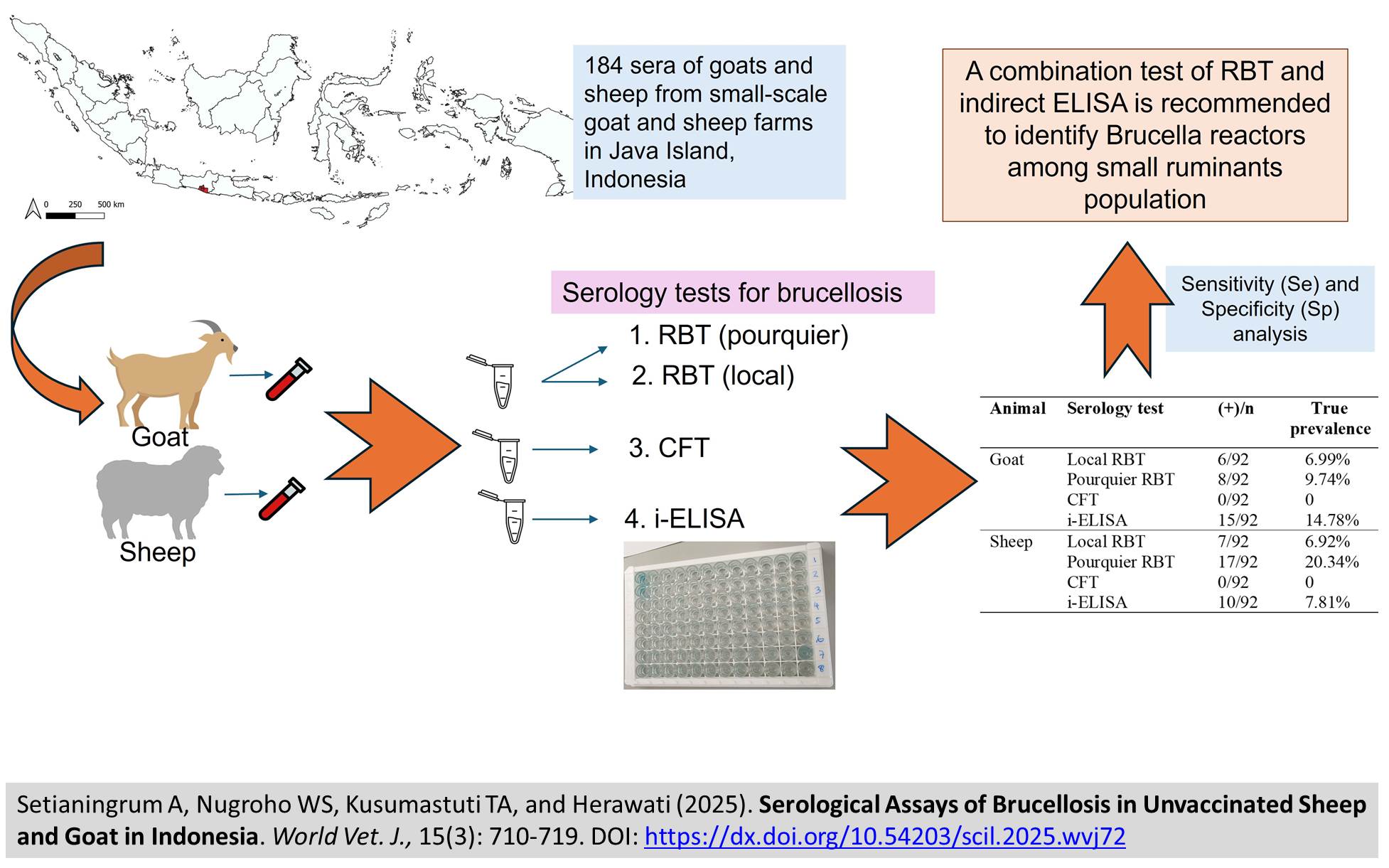 ABSTRACT: Brucellosis is recognized as one of the most widespread zoonotic diseases and is often overlooked, impacting livestock populations worldwide. Annual routine screenings utilize serological assays, such as the Rose Bengal test (RBT) and the complement fixation test (CFT), to identify the presence of brucellosis. The present study aimed to evaluate the diagnostic and discriminative performance of the CFT, the locally produced RBT antigen from Indonesia, the commercial RBT antigen (Pourquier), and the indirect enzyme-linked immunosorbent assay (ELISA) using sera from Indonesian goats and sheep. A total of 184 serum samples were collected, including 92 from goats and 92 from sheep. The samples were obtained through jugular venipuncture from animals on small-scale goat and sheep farms in Java Island, Indonesia. The results were analyzed to determine true prevalence (TP), accuracy, and cross-tabulation with parallel interpretation to assess the sensitivity and specificity of each test analysis. The TP of brucellosis in small ruminant serum samples using local RBT, Pourquier RBT, CFT, and indirect ELISA was 6.99%, 9.74%, 0%, and 14.78% in goats, and 6.92%, 20.34%, 0%, and 7.81% in sheep, respectively. Moderate Kappa interrater reliability was observed between the local and Pourquier RBTs for both goats (0.537) and sheep (0.440). The combined RBT sensitivity in goats and sheep was 27% and 20%, respectively, while the combined RBT specificity was 92% in goats and 80.5% in sheep. Using more than one diagnostic method is essential for screening and investigating brucellosis in goat and sheep populations. A combination of RBT and indirect ELISA tests is recommended to identify Brucella reactors among small ruminants in Indonesia.