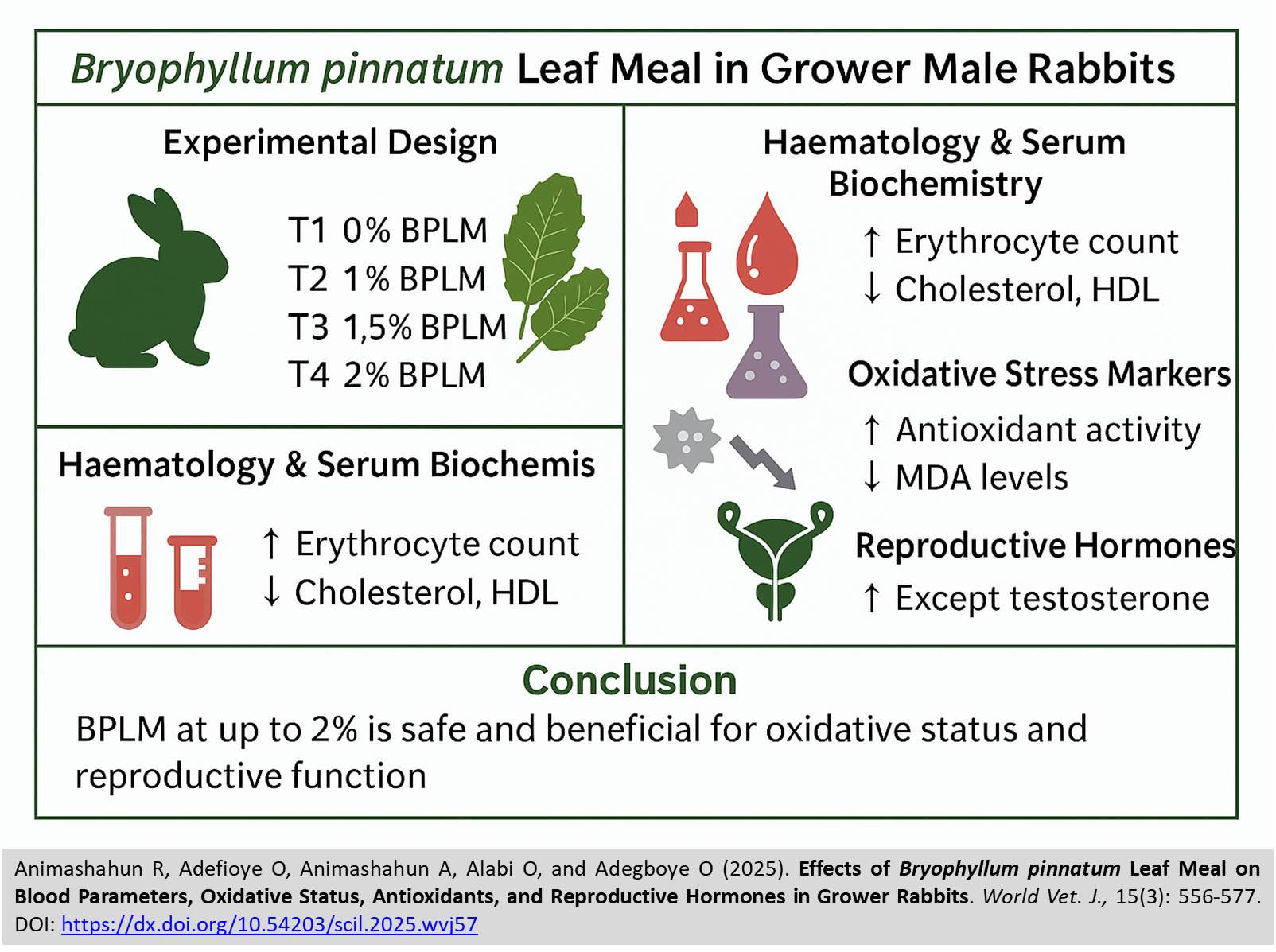 ABSTRACT: In the search for safe and effective phytogenic alternatives to synthetic additives in rabbit nutrition, Bryophyllum pinnatum has shown promising biological potential. This study investigated the effects of dietary inclusion of Bryophyllum pinnatum leaf meal (BPLM) on hematological parameters, serum biochemistry, oxidative stress markers, and reproductive hormone levels in grower male rabbits. A total of 48 Hyla grower male rabbits, aged 7–8 weeks, were randomly allotted to four dietary treatments in a completely randomized design (CRD): T1 (0% BPLM), T2 (1% BPLM), T3 (1.5% BPLM), and T4 (2% BPLM), with 12 rabbits per group, further subdivided into three replicates of four animals each. After an 10-week feeding trial, blood samples were collected and analyzed for hematological indices (erythrocyte count, packed cell volume, hemoglobin concentration, erythrocyte indices, total and differential white blood cell counts), biochemical parameters (liver enzymes, total protein, glucose, cholesterol, triglycerides, low-density lipoprotein, and high-density lipoprotein [HDL]), oxidative stress markers (malondialdehyde [MDA] and 2,2-diphenyl-1-picrylhydrazyl scavenging activity [DPPH]), and reproductive hormones. The majority of hematological and biochemical parameters were not significantly affected by BPLM inclusion, indicating no adverse impact on physiological homeostasis. However, erythrocyte count, serum cholesterol, and HDL levels showed significant differences. Erythrocyte count increased progressively from 0% to 1.5% BPLM inclusion, but declined at the 2% level. Serum cholesterol decreased gradually with increasing BPLM inclusion, with the lowest value observed at 2%. Antioxidant activity improved significantly with increasing BPLM levels, as evidenced by enhanced DPPH scavenging capacity and reduced MDA concentrations, particularly at 1.5% and 2% inclusion. Furthermore, reproductive hormones, apart from testosterone, were significantly elevated in rabbits fed diets containing 1.5% and 2% BPLM, suggesting enhanced reproductive function. Overall, these findings indicate that dietary inclusion of BPLM up to 2% is safe and beneficial for growing male rabbits, with positive effects on antioxidant defense and reproductive performance. The functional phytogenic properties of Bryophyllum pinnatum (B. pinnatum) leaves highlight their potential as a natural feed additive for improving rabbit health and productivity.