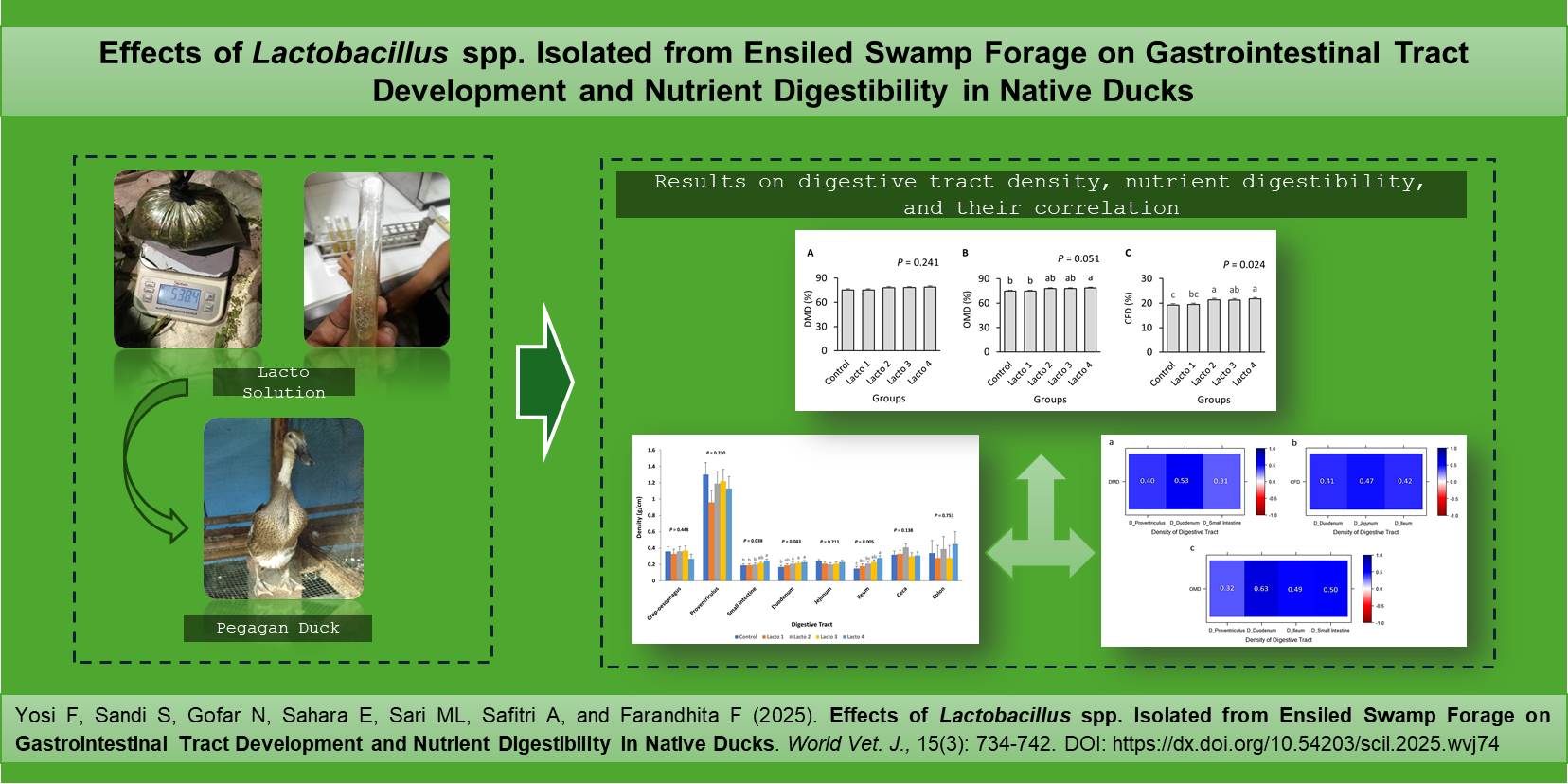 ABSTRACT: The application of lactic acid bacteria (LAB), particularly Lactobacillus, as feed additives has demonstrated benefits for poultry, including enhanced gut function and better nutrient digestion. However, studies on LAB derived from swamp grass silage remain limited. The present study aimed to evaluate the effects of supplementing Lactobacillus spp. (Lacto) solution derived from ensiled swamp forage (Hymenachne acutigluma) at different concentrations through drinking water on the relative weight and length, as well as intestinal density and nutrient digestibility of native ducks. The relationship between intestinal tract density and nutrient digestibility was assessed using the Pearson correlation coefficient. The present study involved sixty 24-week-old native ducks, divided into five groups with four replicates each. The groups included a control group and groups that received Lacto solutions in their drinking water. The Lacto solutions were at concentrations of 1×106 CFU/mL (Lacto 1), 1×107 CFU/mL (Lacto 2), 1×108 CFU/mL (Lacto 3), and 1×109 CFU/mL (Lacto 4). The current results indicated that supplementation of the Lacto solution in drinking water increased the relative weights of the proventriculus, small intestine, duodenum, jejunum, ileum, and ceca. The relative weight and density of the intestine in the Lacto groups increased linearly with higher concentrations of Lacto solution. Compared to the control group, ducks receiving Lacto supplementation showed improved crude fiber digestibility (CFD) and a tendency to enhance organic matter digestibility (OMD). In 33-week-old ducks, a higher proventriculus density was associated with increased dry matter digestibility (DMD) and OMD. Additionally, the densities of the duodenum, jejunum, and ileum were positively correlated with DMD, OMD, and CFD. The present findings indicated that the administration of Lacto solution at increasing concentrations up to 109 CFU/mL via drinking water effectively improved the development of the small intestines of ducks, which was indicated by an increase in the intestinal relative weight and density, as well as enhancing the OMD and CFD in the diets.