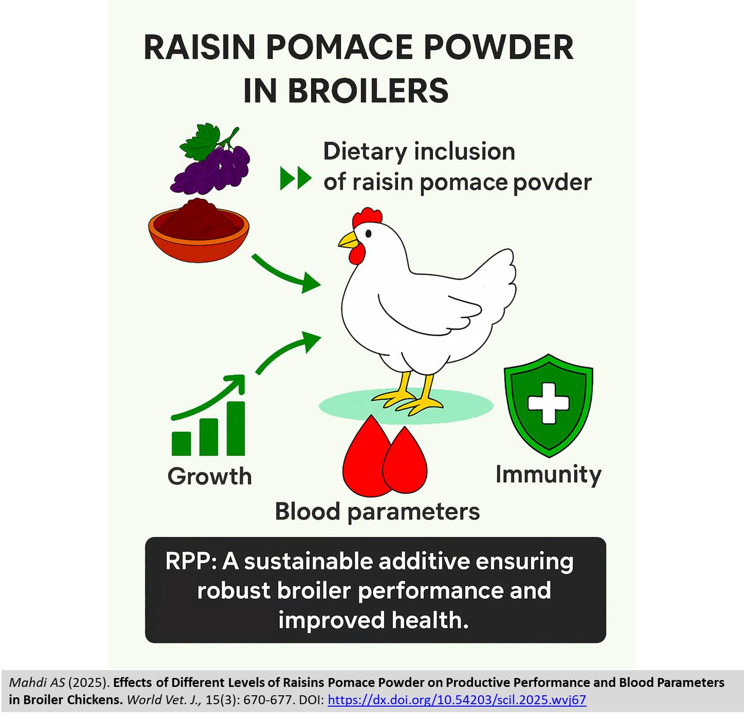 ABSTRACT: One of the primary concerns in poultry farming is the exploration of natural feed ingredient alternatives that are, concurrently, more cost-effective and environmentally sustainable. Raisin pomace powder (RPP), a by-product from grape processing, may contain numerous beneficial nutrients and natural compounds that contribute to optimal performance in chickens. The present study assessed the impact of incorporating RPP into broiler chicken diets concerning growth performance, carcass characteristics, economic efficiency, blood parameters, and immune indices. A total of 180 unsexed Ross 308 broiler chickens, all one day old with an initial average body weight of approximately 38 g, were randomly divided into four dietary treatments. The present study comprised a control group (T1) and three experimental groups, including 10 g/kg of RPP (T2), 20 g/kg of RPP (T3), and 30 g/kg of RPP (T4). The study duration spanned 35 days, covering both the initial and finisher phases. The present results demonstrated no statistically significant differences in body weight, weight gain, feed intake, dressing percentage, or economic efficiency among the treatment groups. However, the feed conversion ratio was notably higher in T2 in comparison to the control group. Hematological parameters, encompassing packed cell volume, hemoglobin concentration, as well as red and white blood cell counts, were not significantly influenced by the inclusion of RPP. Serum levels of total protein and globulin remained stable across groups, whereas albumin levels exhibited a significant decrease in T4. Additionally, cholesterol levels were reduced in T3 compared to T1. The current findings suggested that RPP can be included in broiler diets up to 30 g/kg without adverse effects on productivity, physiological status, or immune development. Utilizing RPP provided a sustainable strategy for poultry nutrition through the employment of agro-industrial by-products, thereby potentially improving feed resource efficiency and environmental sustainability.