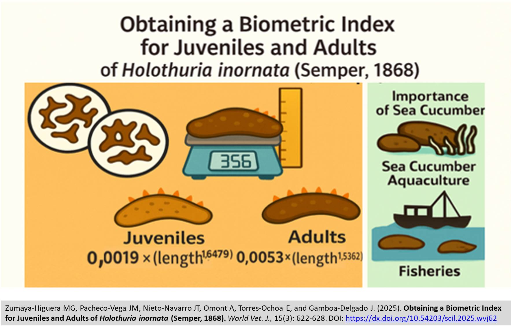 ABSTRACT: The sea cucumber Holothuria inornata (H. inornata) is a species at risk in Mexico. To help protect this species, it is important to provide information related to biological and fisheries management. The present study aimed to predict the weight of the sea cucumber (H. inornata) using biometric measurements such as wet weight and dry weight. A total of 267 H. inornata were manually collected from El Borrego Beach in the municipality of San Blas, Nayarit, Mexico. Species identification involved characterizing calcareous ladders. Each specimen was sedated using xylazine 10%, and measurements were taken out of water with a digital scale. Multiple linear regressions were performed, with size serving as the independent variable and wet weight, dry weight, and humidity percentage as dependent variables. A general equation was developed to predict the wet weight of the H. inornata at the juvenile stage. For correlations based on dry weight, the following equations were established. In immature adults, including dry weight, the equation was 0.0019 × (length^1.6479); and in mature adults, including dry weight, it was 0.0053 × (length^1.5362). The biometric parameters used for weight estimation exhibited a high degree of correlation with actual weight. Wet weight was the biometric parameter that showed the best fit among the studied parameters. Utilizing these biometric indices facilitates the recording of wet and dry weights for interested parties, thereby supporting population and biomass evaluations within the H. inornata fishery and aquaculture sectors.