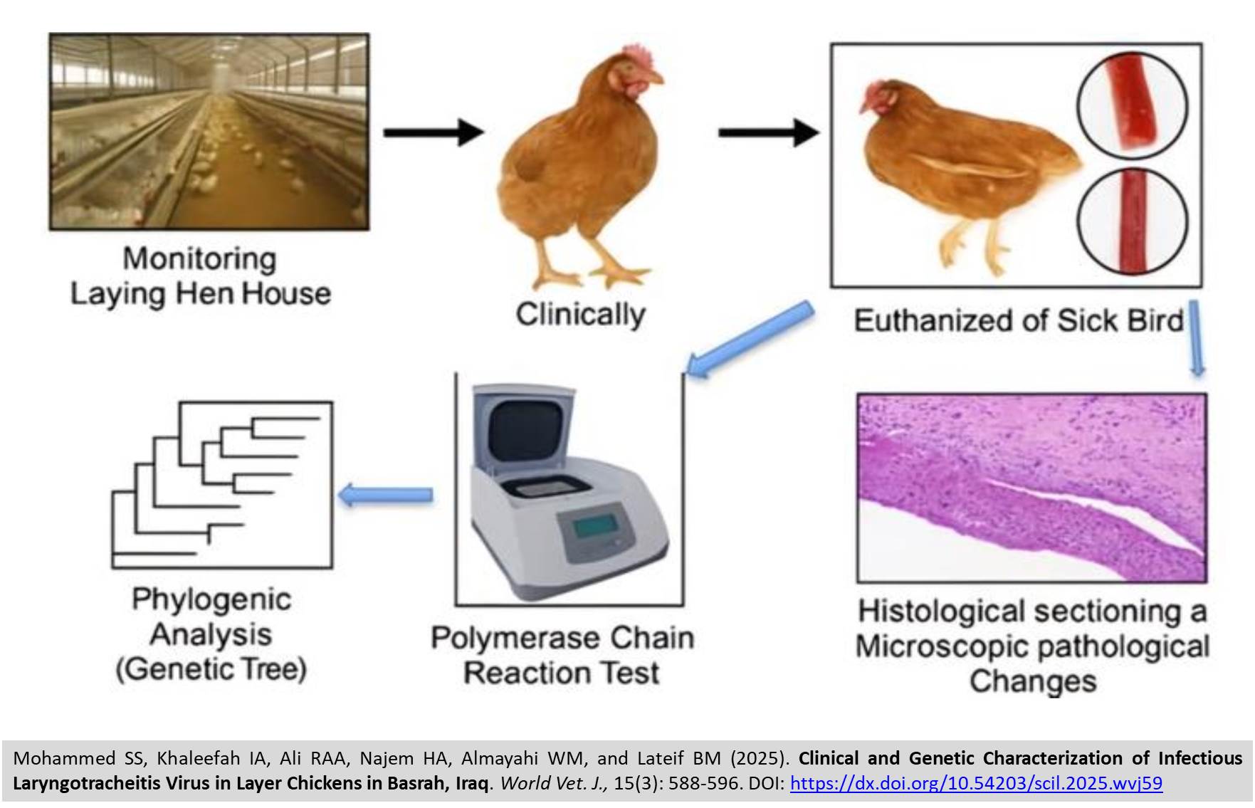 ABSTRACT: Infectious Laryngotracheitis (ILT) has been widely prevalent in numerous countries in recent years. The present study aimed to detect ILT in chickens exhibiting clinical suspicion, utilizing molecular analytical techniques in Basrah, Iraq. Clinical signs, histological changes, and polymerase chain reaction (PCR) were used to diagnose thirty-five samples collected from clinically suspected chickens, including trachea and lungs for histopathology and PCR testing for the p32 gene. The present study demonstrated that the three isolates of ILTV, including ILT-BASRAH 1, ILT-BASRAH 2, and ILT-BASRAH 3, caused the typical signs and pathological changes of ILT in layers chickens. Phylogenetic analyses indicated that ILT-BASRAH 1 exhibited a distant relationship with other current local isolates. Conversely, the isolates ILT-BASRAH 2 and ILT-BASRAH 3 exhibited a close relationship with each other. The initial results indicated that ILT-BASRAH 1 exhibited high nucleotide similarity to MK895003.1, MK895000.1, and MK894999.1 from Australia, which are representative of recombinant strains derived from live attenuated vaccine strains, as well as PQ232589.1 from Georgia. Furthermore, ILT-BASRAH 2 and ILT-BASRAH 3 were identified as vaccine-related isolates. These isolates demonstrated a high level of genetic similarity and a close phylogenetic relationship to the Gallid alphaherpesvirus 1 isolate TJ2019 (GenBank accession no. PP062931.1), originating from Chinese source flocks. The current study determined that ILT-BASRAH isolates 1, 2, and 3 exhibited genetic similarity, suggesting that they likely originated from the same or closely related sources. Their difference from vaccine strains, including the minor variation in ILT-BASRAH 1, might indicate regional viral adaptation.