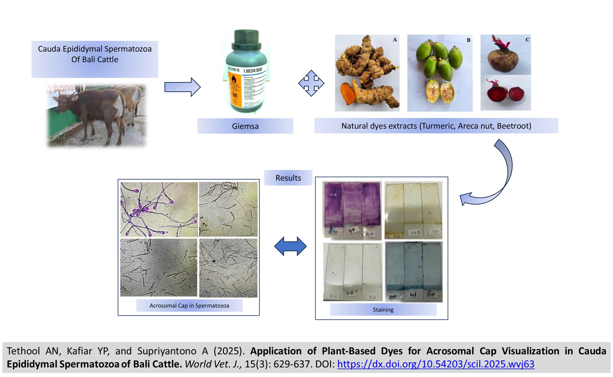 ABSTRACT: The cauda epididymis contains mature spermatozoa capable of fertilization, with acrosomal integrity being a crucial factor in their function. Damage to the acrosome impairs the viability and fertilizing ability of spermatozoa. Conventional staining methods, such as Giemsa or fluorescence microscopy, are effective but less practical in low-resource settings. The present study aimed to evaluate damage to the acrosomal cap of cauda epididymal spermatozoa in Bali cattle and to assess the integrity of the acrosomal cap using Giemsa and natural dyes such as turmeric, beetroot, and areca nut extract. The present study utilized cauda epididymal spermatozoa from Bali cattle aged 3-4 years and weighing 316-412 kg. The study employed a completely randomized design with four treatments, each replicated 20 times. The treatments were Giemsa stain 100% (Control, P0), 10% Giemsa + 90% turmeric extract (P1), 10% Giemsa + 90% beetroot extract (P2), and 10% Giemsa + 90% areca nut extract (P3). Using Giemsa and natural dyes resulted in different colors of spermatozoa acrosomes. The P0 preparations exhibited a dark purple coloration, P1 appeared yellowish, corresponding to the turmeric pigment, and P3 appeared bluish, while P2 demonstrated no detectable staining on the slides. The acrosomal caps of spermatozoa in P0 were dark purple, those in P1 were yellowish, and those in P2 and P3 were unstained (Transparent or faint). The average acrosomal cap integrity was the highest in P0, followed in order by P1, P2, and P3. Based on the current findings, it can be concluded that P1, P2, and P3 signified acrosomal cap integrity in cauda epididymal spermatozoa of Bali cattle. However, P1 produced the best results, showing a distinguishable color and the highest acrosomal cap integrity score (86.9 ± 2.0%). Beetroot and areca nut extracts produced weaker staining and lower acrosomal integrity values. Therefore, turmeric extract may serve as a practical, cost-effective, and environmentally friendly alternative for acrosome evaluation in veterinary reproductive laboratories, particularly in resource-limited settings.