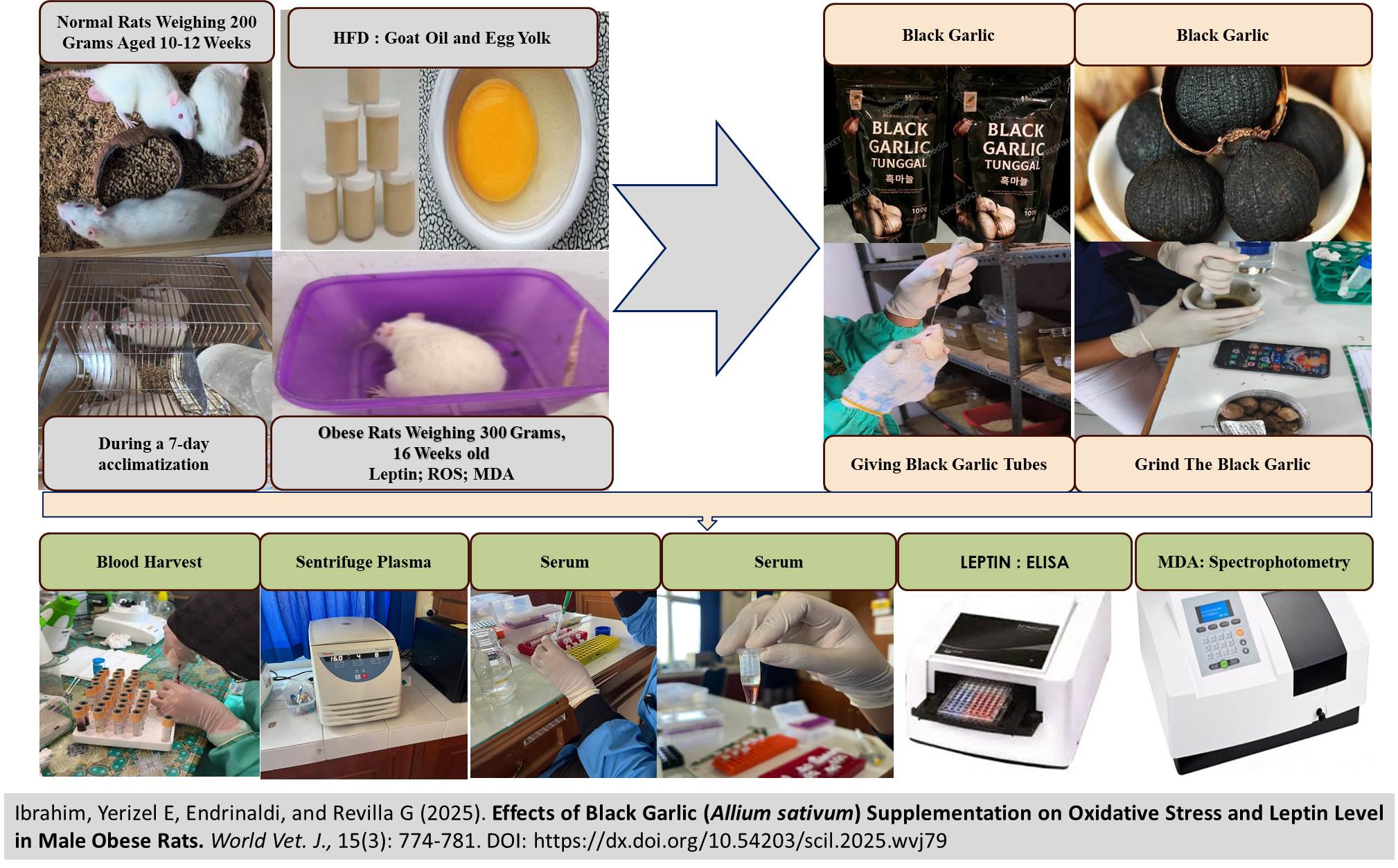 ABSTRACT: Obesity is characterized by excessive fat accumulation in tissues, leading to leptin resistance and chronic inflammation. Black garlic is a well-documented natural remedy capable of improving leptin resistance and oxidative stress through its antioxidant compounds, such as S-Allyl cysteine and polyphenol flavonoids. The present study aimed to evaluate the effects of black garlic on oxidative stress and leptin levels in obese male rats. Twenty-five adult male Wistar rats, aged 10 to 12 weeks and weighing approximately 200 g, were divided into five experimental groups, each comprising five rats. These groups included a negative control group fed a standard diet (K1), a positive control group given a high-fat diet (K2), Treatment group 1 receiving a high-fat diet plus 200 mg of black garlic (P1), Treatment group 2 receiving a high-fat diet plus 400 mg of black garlic (P2), and Treatment group 3 receiving a high-fat diet plus 800 mg of black garlic (P3). The rats received black garlic orally for 28 days. The blood samples were analyzed for markers of oxidative stress, specifically malondialdehyde, as well as leptin levels. The present findings indicated that black garlic significantly decreased malondialdehyde and leptin concentrations in groups P1, P2, and P3 compared to the positive control group. Black garlic, administered at doses of 200, 400, and 800 mg, demonstrated the capacity to diminish oxidative stress and leptin levels in obese male rats.