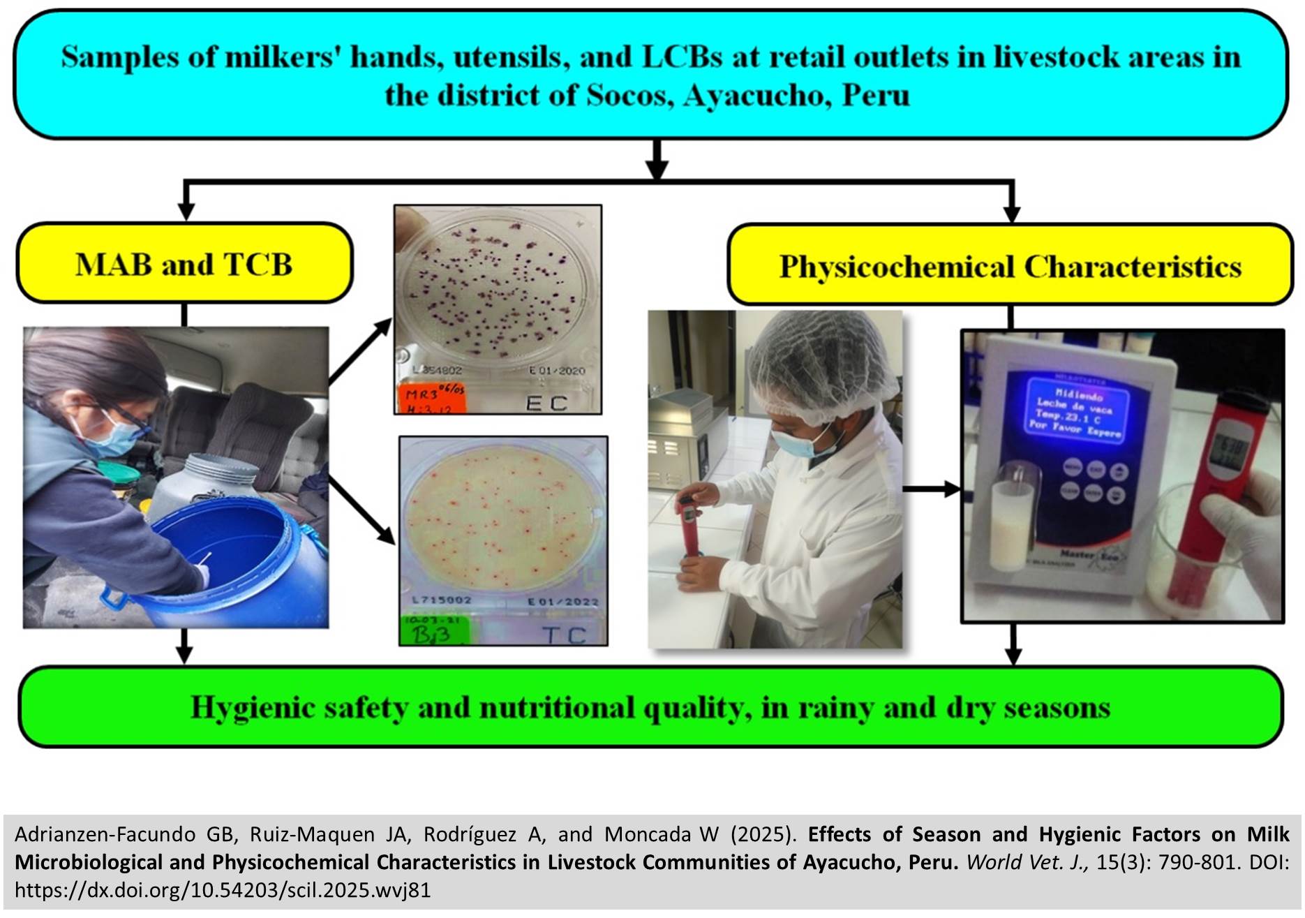 ABSTRACT: Climatic changes can influence milking practices and the dairy production chain, thereby influencing the microbiological safety and physicochemical quality of raw bovine milk (RBM), with potential implications for public health. The present study aimed to evaluate the effects of seasonal variability on the hygienic factors and characteristics of RBM produced in livestock communities in the Socos district, Ayacucho, Peru. For mesophilic aerobic bacteria (MAB) and total coliform bacteria (TCB), the compact dry plate method was used. Sixty random samples were collected during the rainy season (RS) and the dry season (DS). Samples were taken from milkers' hands (six in the RS and six in the DS), rags (six in the RS and six in the DS), buckets (six in the RS and six in the DS), receiving tanks (eight in the RS and eight in the DS), and distribution centers (four in the RS and four in the DS). To evaluate physicochemical characteristics, including density, fat, protein, total solids, lactose, pH, and mineral salts, eight samples of Brown Swiss cattle RBM were collected directly from the tanks (four in the RS and four in the DS) of two distribution point centers. The present results indicated that the MAB count for hygienic factors was lower in the DS than in the RS, except in the milker's hands and distribution centers. For the TCB count related to hygienic factors, the values were lower in the DS than in the RS, except in receiving tanks and distribution centers. In the RS, the physicochemical qualities complied with the Peruvian Technical Standard (PTS), except for protein content and mineral salt levels. In the DS, the physicochemical quality did not comply with the PTS; however, these properties were within acceptable limits in the receiving tanks for MAB and on the milker's hands for TCB. As a result, the bacterial load on inert surfaces and the characteristics of RBM were lower in the DS compared to the RS. Still, contamination during milking and at distribution centers was greater.