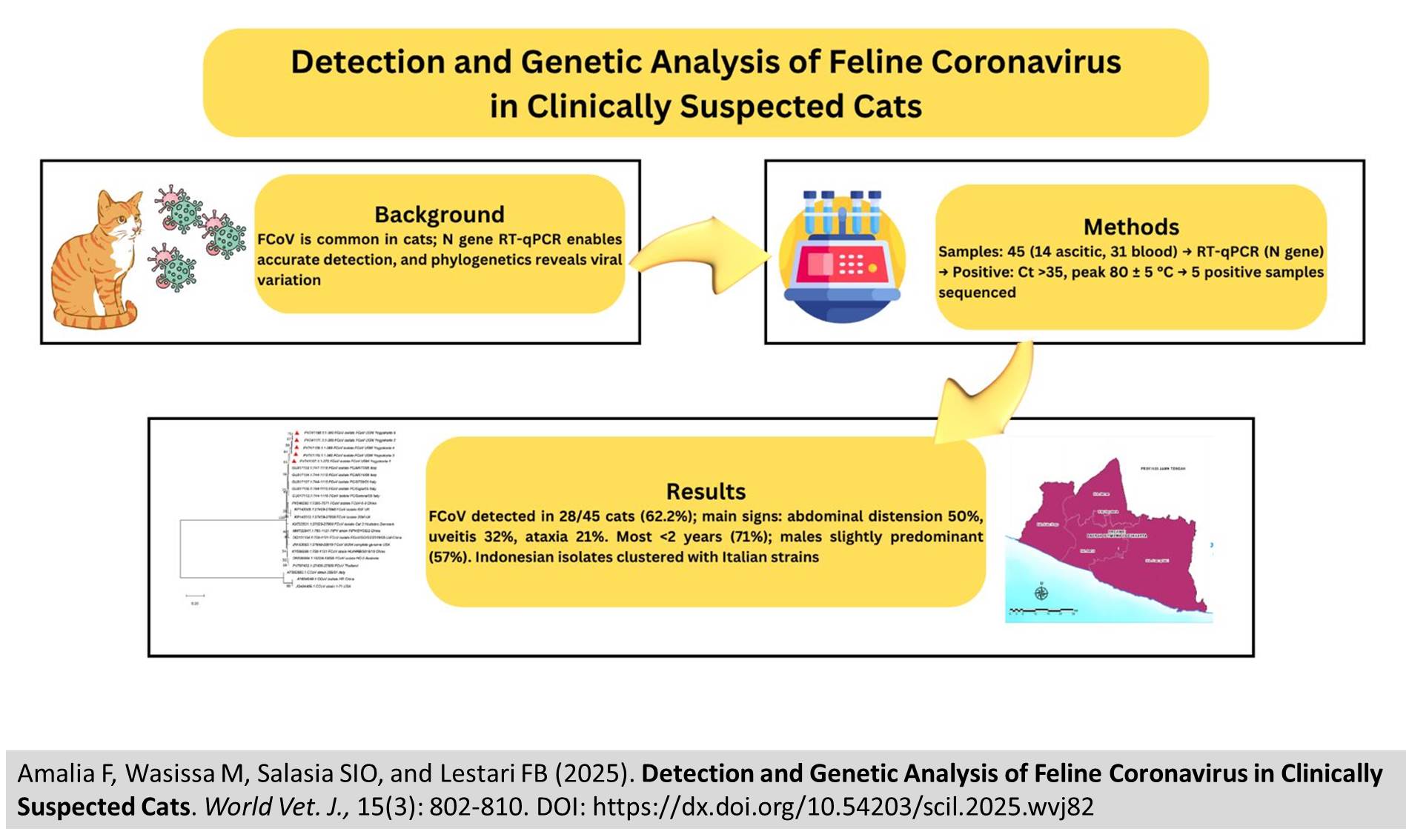 ABSTRACT: Feline coronavirus (FCoV) is a common infection in cats, producing outcomes that differ from mild intestinal disease to the fatal form known as feline infectious peritonitis (FIP). Accurate antemortem diagnosis is challenging, and reverse transcription-quantitative polymerase chain reaction (RT-qPCR) targeting the nucleocapsid (N) gene offers high sensitivity and specificity, while phylogenetic analysis reveals viral variation. The present study aimed to detect FCoV in clinically suspected cats using RT-qPCR and to analyze the phylogenetic relationships of local isolates from Yogyakarta, Indonesia. A total of 45 clinical samples, consisting of 14 ascitic fluid and 31 blood samples, were collected from cats of different breeds (mixed, domestic shorthair, and Persian), aged 0.5-4 years, including 22 males and 23 females, that were presented to seven veterinary clinics in Yogyakarta with clinical signs such as vomiting, diarrhea, abdominal effusion, uveitis, and ataxia. The RT-qPCR revealed 62.2% (28/45) positive cases, with detection rates of 100% (14/14) in ascitic fluid and 45.2% (14/31) in blood. The most frequent clinical findings among FCoV-positive cats were abdominal distension (50%), uveitis (32.1%), ataxia (21.4%), and rhinitis (17.9%). Most infected cats (71.4%) were under two years of age, with a slightly higher prevalence in males (57.1%). Phylogenetic analysis of three isolates from ascitic fluid demonstrated a close genetic relationship with strains from Italy, the United Kingdom, and China, clustering into two distinct clades. The present study highlighted the utility of RT-qPCR targeting the N gene as a reliable diagnostic tool for clinical cases, while providing new clinicopathological and molecular data on naturally occurring FCoV infection in Indonesia. These findings contribute to the global understanding of FCoV molecular epidemiology and support future surveillance and control strategies for coronavirus infections in domestic cats.