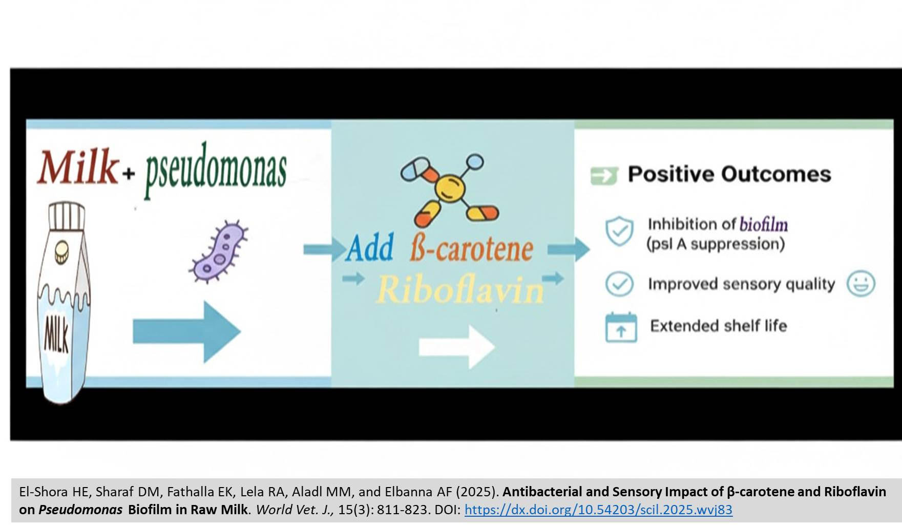 ABSTRACT: Milk is a highly nutritious yet perishable food that is susceptible to microbial contamination and spoilage, particularly by Pseudomonas species. The present study aimed to assess the antimicrobial and sensory effects of β-carotene and riboflavin as natural additives for preserving raw milk, with a specific emphasis on controlling biofilm-forming Pseudomonas strains. A total of 100 raw milk samples were collected from different markets in Gharbia, Egypt, and tested for Pseudomonas spp. Biofilm formation was assessed in isolates, followed by the detection of the quorum-sensing transcriptional regulator lasR, pellicle formation protein A (polysaccharide biosynthesis protein A) pelA, and polysaccharide synthesis locus protein A pslA genes. An in vitro trial was performed on eight groups of raw milk to evaluate the effects of β-carotene and riboflavin at concentrations of 1 µg/ml and 4 µg/ml, respectively, on Pseudomonas counts and sensory properties. The groups include positive control (G1), raw milk inoculated with Pseudomonas and fortified with β-carotene (G2), raw milk inoculated with Pseudomonas and fortified with riboflavin (G3), raw milk inoculated with Pseudomonas and fortified with a combination of β-carotene and riboflavin (G4), negative control (G5), milk fortified with β-carotene only (G6), milk fortified with riboflavin only (G7) and milk fortified with both β-carotene and riboflavin (G8). Reverse transcription polymerase chain reaction (RT-PCR) was performed to assess the impact of these additives on Pseudomonas, specifically on 16S rRNA and pslA gene expression. Pseudomonas spp. were found in 20% of samples, with 75% forming biofilms. The pslA gene was detected in 83.33% of these samples. β-carotene and riboflavin indicated dose-dependent antibacterial effects, with minimum inhibitory concentration values, and minimum bactericidal concentration values. Milk fortified with these compounds, particularly in G4, demonstrated the most significant reduction in Pseudomonas during a 6-day storage period. Additionally, β-carotene maintained a preferable sensory quality compared to other groups. RT-PCR confirmed the highest pslA gene suppression with the combined treatment. The current findings indicated that β-carotene at a concentration of 1 µg/ml, whether used independently or in combination with riboflavin, can serve as an effective natural preservative in dairy products.