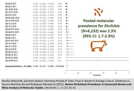 ABSTRACT: While some Ehrlichia species, such as E. ruminantium and E. minasensis, are not popular even among veterinarians, they can infect cattle. The current study aimed to review studies on Ehrlichia spp. to evaluate its worldwide molecular prevalence, given the lack of information about bovine ehrlichiosis and the lack of previous systematic reviews and meta-analyses on this subject. In order to determine the molecular prevalence of Ehrlichia spp. in cattle, a systematic review of the literature was conducted in three databases. A meta-analysis with a random-effects model was performed to calculate the pooled prevalence with 95% confidence intervals (95% CI) and measures of heterogeneity were reported. Subgroup analyses were performed in terms of Ehrlichia species, country, and regions. The literature search yielded 1051 papers until August 1, 2019, with 71 studies entirely eligible for review. The pooled molecular prevalence for Ehrlichia at the individual level (N = 6232) was 2.3% (95% CI: 1.7-2.9%) with the highest value of 82.4%. Studies identified the highest pooled molecular prevalence of 6.6% (95% CI: 0.6-12.7%) for E. canis, followed by E. ruminantium (n = 4695, 75.33%) 52 studies, with 1.7% (95% CI: 1.1-2.3%) and E. chaffeensis with 1.5% (95% CI: 0.0-0.3%). Moreover, the obtained result was indicative of only one study addressing E. minasensis. As the findings suggested, heartwater (E. ruminantium infection) is a notifiable disease of domestic and wild ruminants, recorded by the World Organization for Animal Health. There is a possible risk of endemic heartwater in the Americas due to the climatic features. Furthermore, E. minasensis, E. chaffeensis, and E. canis were observed in cattle although the two last species could be a molecular misidentification with regard to their phylogenetic relationships with E. minasensis.