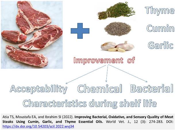 ABSTRACT: The meat industry increasingly considers meat shelf life as a critical problem. Some essential oils contain antibacterial and antioxidant characteristics that help to keep meat safe. Therefore, the purpose of this study was to evaluate the preservation benefits, including antibacterial and antioxidant properties, of cumin, garlic, and thyme essential oils at 1% on chilled beef meat steaks, as well as their effects on pH, total volatile basic nitrogen (TVBN), thiobarbituric acid (TBA), and related sensory aspects (color, odor, appearance, consistency, and overall acceptability). The results of the current study showed that pretreating beef meat steaks with EOs of cumin, garlic, and thyme at a concentration of 1% effectively reduced levels of APC, coliform count, staph aureus count, TVBN, and TBA while extending shelf life to 12, 15, and 18 days when stored at 4°C. In terms of antibacterial and antioxidant properties, shelf life, and sensory quality on beef meat steaks, the thyme essential oil group outperformed cumin and garlic essential oils. The current study introduced an effective natural preservative alternative that could replace undesirable synthetic substances in the future while also lowering antibiotic resistance.