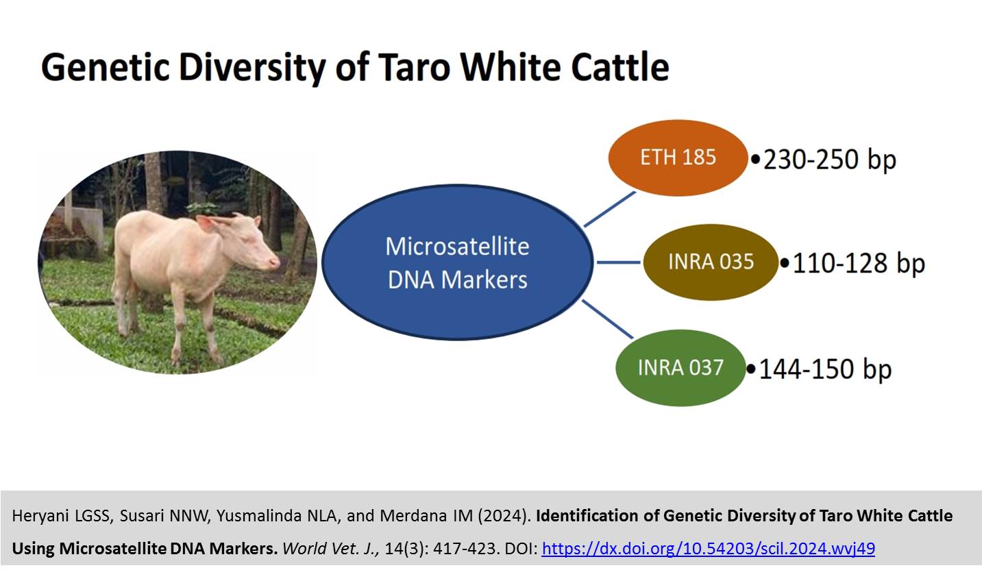 ABSTRACT: Taro white cattle have a small population found in Taro Village, Tegalalang, and Gianyar, Bali, which must be protected as one of the most valuable biological resources for the Hindu community in Bali. White cattle require conservation efforts, with morphometric characterization and genetics providing the first phases of an animal conservation program. The purpose of this study was to identify the genetic diversity of Taro white cattle based on allele frequency, heterozygosity, and fixation index (FIT) using different microsatellite DNA loci so that it can be used as a study and reference in determining policies for the conservation of Taro white cattle in Indonesia, particularly in Bali. This cross-sectional observational study utilized ETH 185, INRA 035, and INRA 037 microsatellite DNA markers. Polymerase chain reaction amplified a total of 22 Taro white cattle blood samples with an average of 4.33 alleles; the average observed heterozygosity and expected heterozygosity were 0.288 and 0.637, respectively, with an average fixation index value of 0.55. In conclusion, there is a significant deviation from the Hardy-Weinberg equilibrium with the likelihood of inbreeding, as indicated by the Hardy-Weinberg balance. The microsatellite loci used in this study can be further used to evaluate the genetic diversity of Taro white cattle.